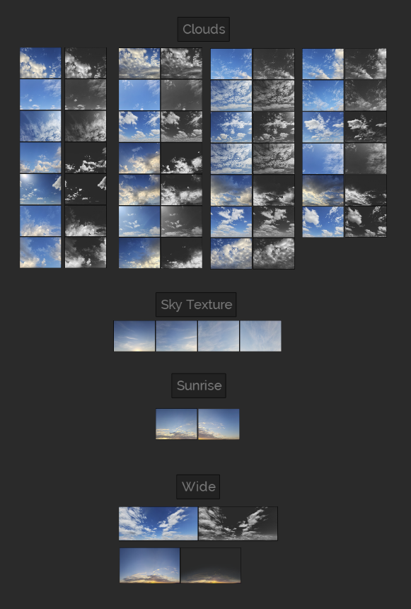Most of the cloud assets that contain unique shapes and formations have been pre-keyed be removing the blue channel of the sky as a matte so these can be used as Mattes in the colored files or just dropped in to start compositing.